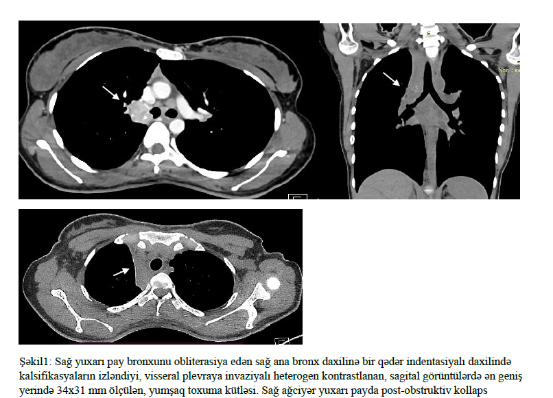 Ağciyər karsinoid şişləri, pulmonar neyroendokrin şişlər olaraq tanınır və ağciyərin nadir rast gəlinən şişlərindən biridir. Bu şişlər, xüsusilə Tipik karsinoid tipi, digər ağciyər xərçəngi tipləri ilə müqayisədə daha yaxşı proqnoza malikdir. Bununla belə, bəzi hallarda xəstələrdə xəstəliyin təkrarlanması və metastaz müşahidə edilə bilər. 24 yaşlı xəstənin sağ ağciyər yuxarı payında post-obstruktiv kollaps və hemoptizi şikayəti olduğu halda, yalnız 2 il sonra Tipik Karsinoid Şiş diaqnozu qoyulmuşdur. Bu fakt, Tipik karsinoid şişlərin yavaş irəliləməsinə baxmayaraq, erkən diaqnostikanın və multidisiplinar yanaşmanın xəstələrin müalicə və proqnozlarına əhəmiyyətli təsir göstərdiyini vurğulamağa imkan verir. Ağciyər karsinoid şişləri bütün neyroendokrin şişlərin 20-30%-ni və ağciyər mənşəli xərçənglərin təxminən 1-2%-ni təşkil edən nadir rast gəlinən şişlərdir. Ağciyər karsinoidlər digər ağciyər xərçəngi alt tipləri ilə müqayisədə daha yaxşı sağqalma göstəricisinə malikdirlər (1,2). Karsinoid ağciyər şişləri daha çox döş qəfəsində ağrı, xırıltı, hemoptizi, post-obstruktiv kollaps və ya post-obstruktiv pnömoni, əlamətləri və simptomları ilə qarşımıza çıxabiler. Təqdim edəcəyimiz klinik halda hemoptizidən 2 il sonra diaqnozu qoyulmuş sağ ağciyərin aşağı dərəcədə differensiya edilmiş (G1) karsinoid şişindən bəhs edilmişdir. Klinik hal 24 yaşlı xəstə 2 ildir davam edən hemoptizi, döş qəfəsində ağrı və döş qəfəsində xışıltı şikayəti ilə klinikamıza müraciət etmişdir. Yanaşı gedən xəstəliyi yoxdur. Fiziki müayinədə ağciyərlər üzərində yayılmış bilateral xırıltılar eşidildi. Saturasiya otaq havasında SpO2 86% ölçüldü. Laborator analizlərində dəyərləri normal aralıqdaydı. Çəkilən PAAG’de sağ üst zonda atelektazi olması səbəbiylə döş qəfəsi KT planlandı. Döş qəfəsi KT’də sternum cismində 30x32 mm ölçüdə santarli litik sklerotik lezyon izlənildi, sağ ağciyər hilusunda sağ yuxarı pay bronxunu obliterasiya edən sağ ana bronx daxilinə bir qədər indentasiyalı daxilində kalsifikasyaların izləndiyi, visseral plevraya invaziyalı heterogen kontrastlanan, sagital görüntülərdə ən geniş yerində 34x31 mm ölçülən, yumşaq toxuma kütləsi, sağ ağciyər yuxarı payda post-obstruktiv kollaps izlənildi (şəkil 1). Mediastinumda, sağ ana bronx qonşuluğunda, karina səviyyəsində orta xəttin solunda, sol ana bronxun anterior qonşuluğunda 14x12 mm ölçülən limfa düyünlər (LAP) izlənildi. Sternum cisminde 3 sm ölçüde sklerotik lezyon (metastaz?), dalaq parenximasında nonspesifik 6 mm ölçüdə hipodens struktur izlənildi. (şəkil 2). Xəstəyə bronxoskopiya planlandı. Bronkoskopiya zamanı sağ üst lob mənfəzini tama yaxın bağlayan ve sağ ana endobronşiyal lümenə uzanan lezyon görüldü, forceps biyopsiya alındı. Patologiya nəticəsi Karsinoid tümör, NOS şəklində raporlandı. Xəstəyə karsinoid tümör diaqnozu ilə lobektomiya, limfadenektomiya edildi (şəkil 3). Rezeksiyon materialın patoloji nəticəsində tipik karsinoid tümör və limfalarda non nekrotizan qranülomatoz iltihab görüldü. Non nekrotizan qranülomatoz iltihab paraneoplastik sendrom olan sarkoid benzer reaksiyona bağlı olabiləcəyi düşünüldü. Xəstəyə əməliyyatdan 2 ay sonra kontrol döş qəfəsi KT planlandı.