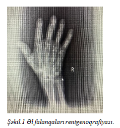 73 yaşlı kişi xəstə nəfəs darlığı, təngnəfəslik, ətraflarda neyropatik ağrı, halsızlıq şikayətləri ilə klinikamıza müraciət etmişdir. Xəstə uzun illərdir ki, AXOX xəstəliyindən əziyyət çəkdiyini bildirir ve buna bağlı uzun müddətdir ki, oral steroid qəbul edir. Obyektiv müayinədə dəri və selikli qişaları solğun, bədənin müxtəlif nahiyələrində lipomalar, sol sağrı nahiyəsində axıntılı yarası mövcüddur. Ayaqlarında Hallux-valgus simptomu müşahidə olunur. Ayaq barmaqlarının anatomik quruluşu pozulmuşdur. Auskultasiyada ağciyərlər üzərində quru fitverici tənəffüs eşidilir. Nazaldan 3 litr Oksigenlə SpO2 - 94%- dir. Laborator analizlərində WBC - 11.41 x 10^3/μL; HGB -14.7 g/dL; MCV-84 fL; PLT-179 x 10^3 ALT- 27.4 U/L, AST- 15.5 U/L, CRP- 18.66 mg/L şəklində ölçülmüşdür. Xəstəyə AXOX kəskinləşməsi müalicəsi (bronxiolitiklərlə inhalyasiya və 5 gün müddətində İ.V 40 mg steroid) ve sarğı nahiyəsindəki axıntılı yarası səbəbiylə Ampicillin- sulbaktam 4x1.5 gr başlanıldı. Xəstədə olan Hallux-Valgus simptomu, oynaqlarda ağrı və öncədən oynaqlarda yer dəyişdirən şişkinliklər və axıntılı yara anamnezinə, əsasən, revmotoloqa konsultasiya edildi. Klinik ve laborator dəyərləndirmə nəticəsində revmotolojik xəstəlik düşünülmədi. Müalicə başladıqdan 3 gün sonra xəstədə AXOX xəstəliyinin kəskinləşməsiylə əlaqədar olan təngnəfəslik yaxşılaşmağa başladı, bronx spazmı azaldı, otaq havasında SpO2 96% olaraq ölçüldü, sarğı nahiyəsindəki yaradan axıntı dayandı. Lakin 2 gün sonra xəstənin əl bilək nahiyəsində şişkinlik və ağrı şikayətləri yarandı. Təkrar Laborator dəyərləndirmədə C - reaktiv zülal (CRP) - 23.07 mg/L Kreatinin - 0.82 mg/dL Sidik cövhəri (urea) - 62.3 mg/dL, Urea nitrogeni (BUN) - 29.1 mg/dL olaraq görüldü. Travmatoloqa konsultasiya edilərək, əl-bilək rentgenoqrafiyası və ENMQ planlandı Əl falanqaları rentgenoqrafiyası ‘‘müayinə sahəsinə daxil olan sümüklərin kölgəliklərinin intensivliyi periartikulyar sahələrdə kəskin olmaqla azalıb. Sağ əlin falanqarası oynaq səthlərinin subxondral sümük səfhələri kobudlaşıb, oynaq yarıqlarının genişliyi məhduddur. Falanqalarda oynaq səthlərinin kənarlarında osteofitlər izlənilir’’ şəklində raporlandı (Şəkil.3). ENMQ müayinəsinde sağda xəstənin əli ödemli və şişkin olması səbəbiylə sinir keçiriciliyi obyektiv dəyərləndirilə bilinmədi. Xəstənin ağrı şikayətlərinin şiddətlənməsi üzərinə, uzun müddət steroid qəbulu səbəbiylə endokrinoloqa konsultasiya edildi və klinik dəyərləndirmədə ön planda Kienböck xəstəliyi düşünülən xəstəyə əl-bilək MRT çəkildi. Eyni zamanda Densitometriya planlandı ve nəticəsi Osteopenia olaraq dəyərləndirildi. Əl, əl-bilək MRT nəticəsi ‘‘osteoartroz əlamətləri. Fleksor tendonların yatağında ciddi maye artışı ( tenosinovit). Os lunatum həcmi bir qədər azalmış olub,6 mm ölçüsündə T1 hipointens, T2/FS hiperintens sahə (keçirilmiş osteonekroza ikincili olduğu düşünülən- Kienbock xəstəliyi əlaməti)’’ şeklinde raporlandı. Kienbock xəstəliyinin müalicəsi travmatoloq tərəfindən planlandı. Xəstə sonrasında kontrola gəlmədiyi üçün dinamikası haqqında məlumatımız yoxdur.